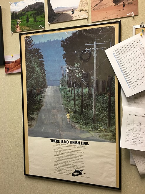 The running quips flow effortlessly in response to questions as he sits for an interview in his office decorated with pictures, posters, shoes and sayings — all running-related.