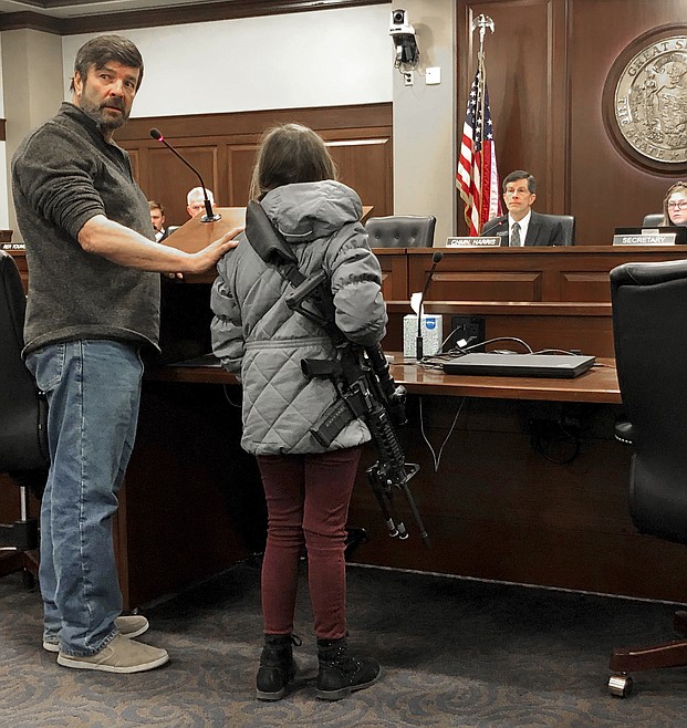 BOISE (AP) — An 11-year-old girl toting a loaded AR-15 assault weapon appeared Monday at a legislative hearing with her grandfather, who is supporting a proposal that would allow visitors to Idaho who can legally possess firearms to carry a concealed handgun within city limits.