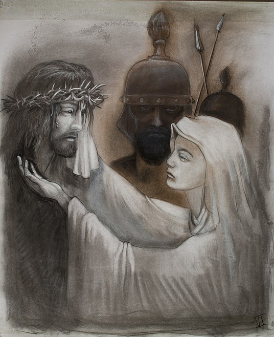 The display is composed of large, detailed original charcoal drawings and depicts the classic devotional service commemorating 14 events in Christ’s journey from Pilate’s judgement hall to Golgotha on the day of his crucifixion. Messing portrayed three further views of the story, expanding his series to 17 drawings. This time period is referred to as the Passion of Christ, The Story of the Crucifixion or The Stations of the Cross.