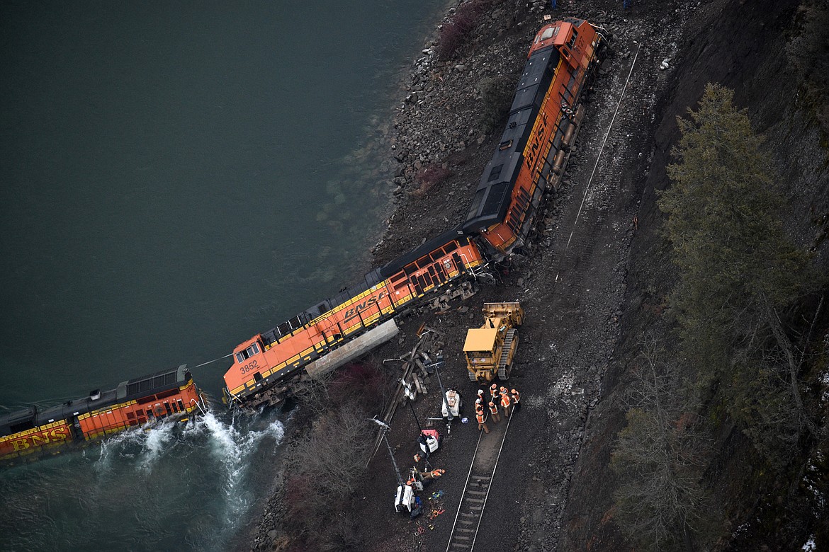 Two of the locomotives — one which ended up on the riverbank and another that ended up in the right of way — were being re-railed Friday with cranes and crews being brought in to do the work. As soon as the locomotives are re-railed, Gus Melonas, director of public affairs for BNSF Railway for the region, said crews were expected to immediately do the necessary track replacement work to get the line open for traffic.