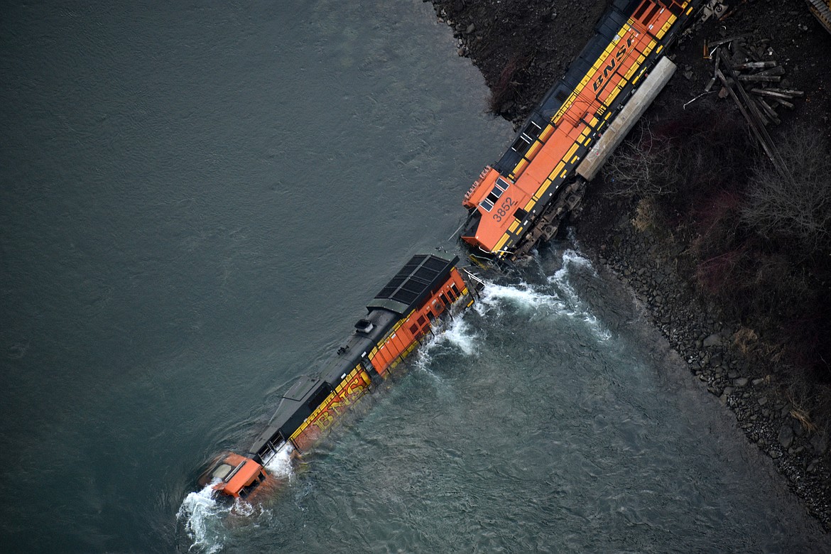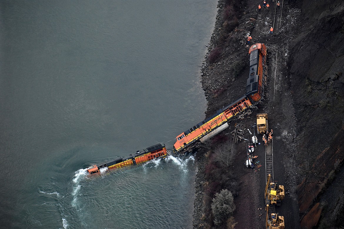 Two of the locomotives — one which ended up on the riverbank and another that ended up in the right of way — were being re-railed Friday with cranes and crews being brought in to do the work. As soon as the locomotives are re-railed, Gus Melonas, director of public affairs for BNSF Railway for the region, said crews were expected to immediately do the necessary track replacement work to get the line open for traffic.
