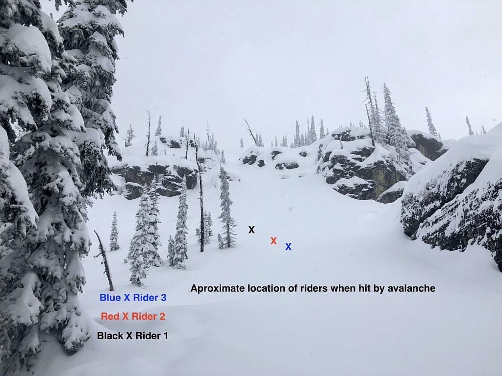 According to the report, one of the three riders had gotten his machine stuck partway up the slope when one of his friends rode up to help dig out the stuck snowmobile. That friend was shortly followed by the third rider, and as he parked his snowmobile by his two friends, an avalanche released, “sweeping all three riders downslope, partially burying rider No. 3 (the last to arrive at the stuck snowmobile) and fully burying riders No. 1 and No. 2.”