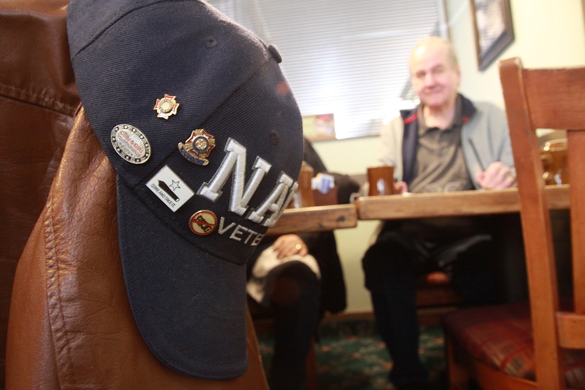 They wear veteran ball caps with the words Vietnam, or Korea, Navy, the Army eagle insignia or the red hats that show the eagle, globe and anchor.