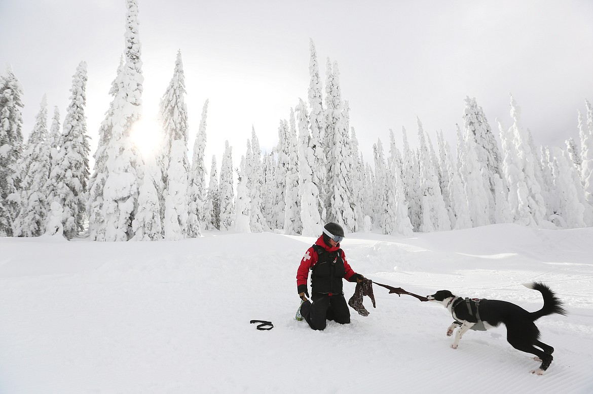 Keagan Zoellner buried a tired green and brown sweater a foot deep in the snow, using a shovel to rough up the top layer in a wide swath surrounding the scent article. Waiting somewhat patiently about 50 yards away sat Cleo — Whitefish Mountain Resort’s newest avalanche dog in training. With the sweater sufficiently hidden, Zoellner retrieved her canine companion, kneeled beside Cleo and released her to search the area.
