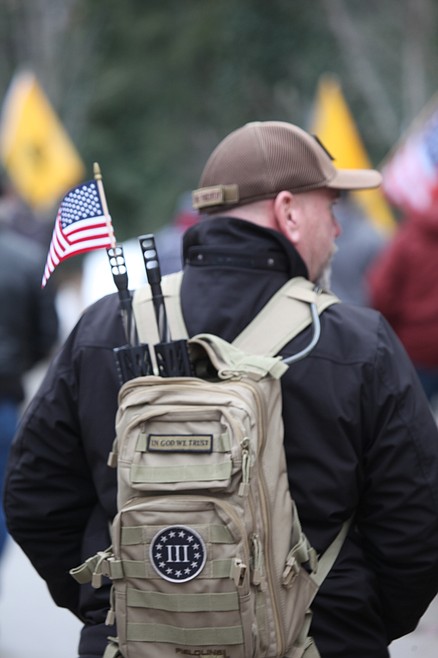 The group then marched to Avista Pavilion in McEuen Park to listen to speakers advocate for the right to bear arms. Baron, who hails from Virginia, said she counted 241 rallygoers at the Pavillion. Armed with American flags and assault rifles, the crowd listened as impassioned 2nd Amendment supporters pontificated on prayer, patriotism and the Constitution.