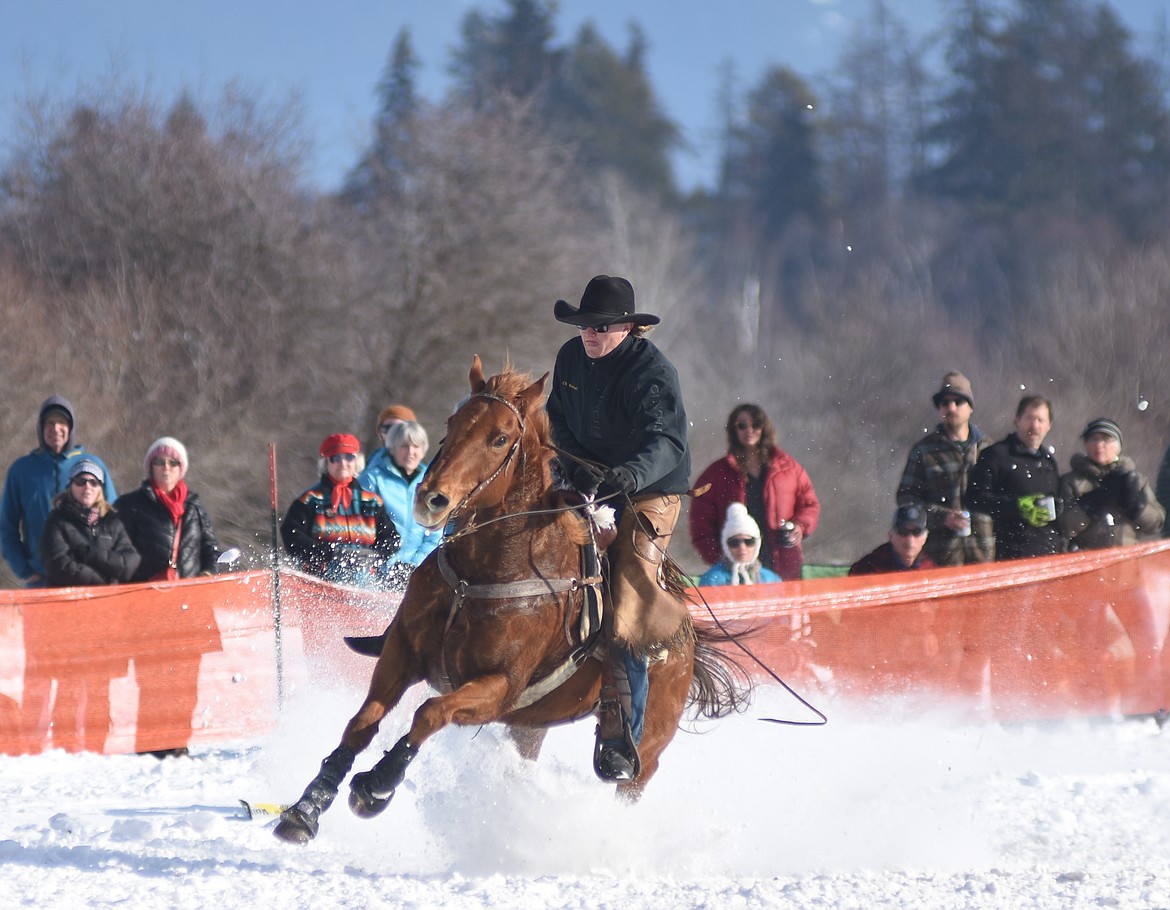 Skijoring is a traditional Winter Carnival event that pairs a horse and rider with a skier being pulled through a course that includes gates, hitting jumps and grabbing rings. The duo with the fastest time wins.