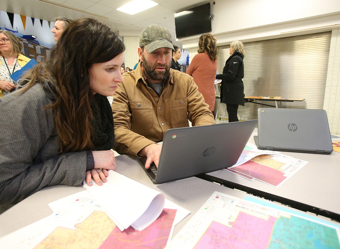 Members of the boundary review committee, who have been studying the subject for months, came up with a first draft of the proposal last week to present to the public during the open house. Maps showing possible changes for elementary, middle and high schools were on display, and laptops for surveys and usage of the new school zone locator map tool were also provided for open house attendees.