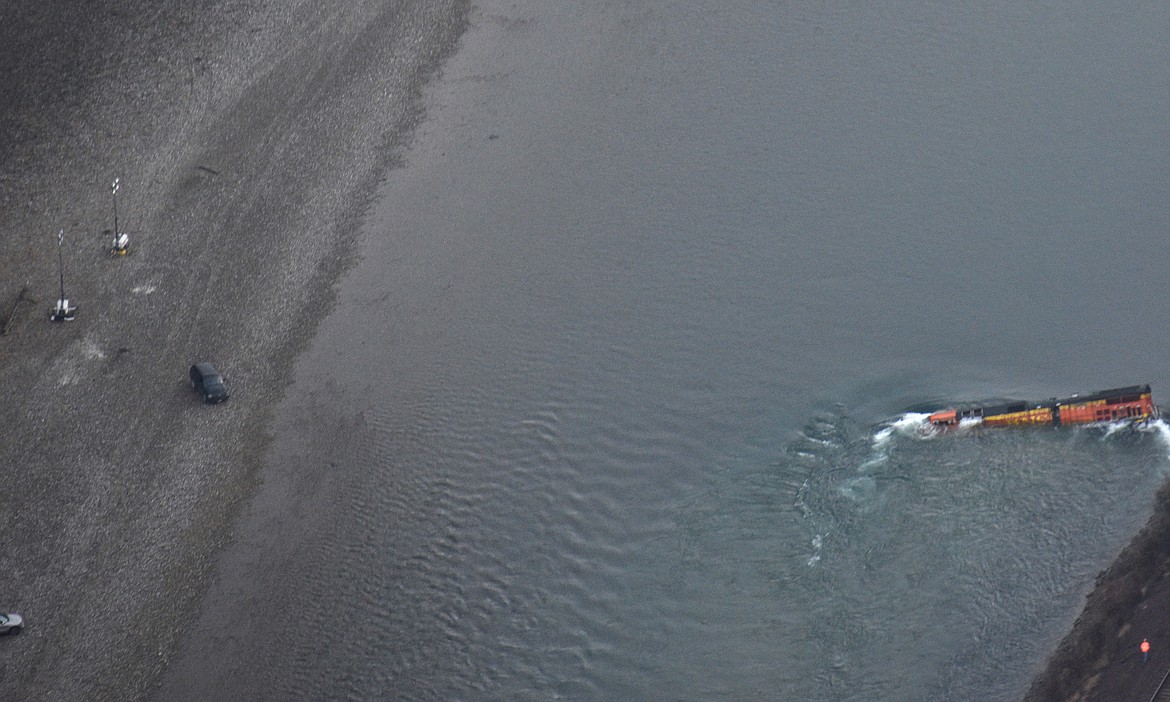“Work is underway to bring out two large ground hoists and about eight bulldozers to help remove the lead locomotive from the river,” said Courtney Wallace, spokeswoman for BNSF Railway.