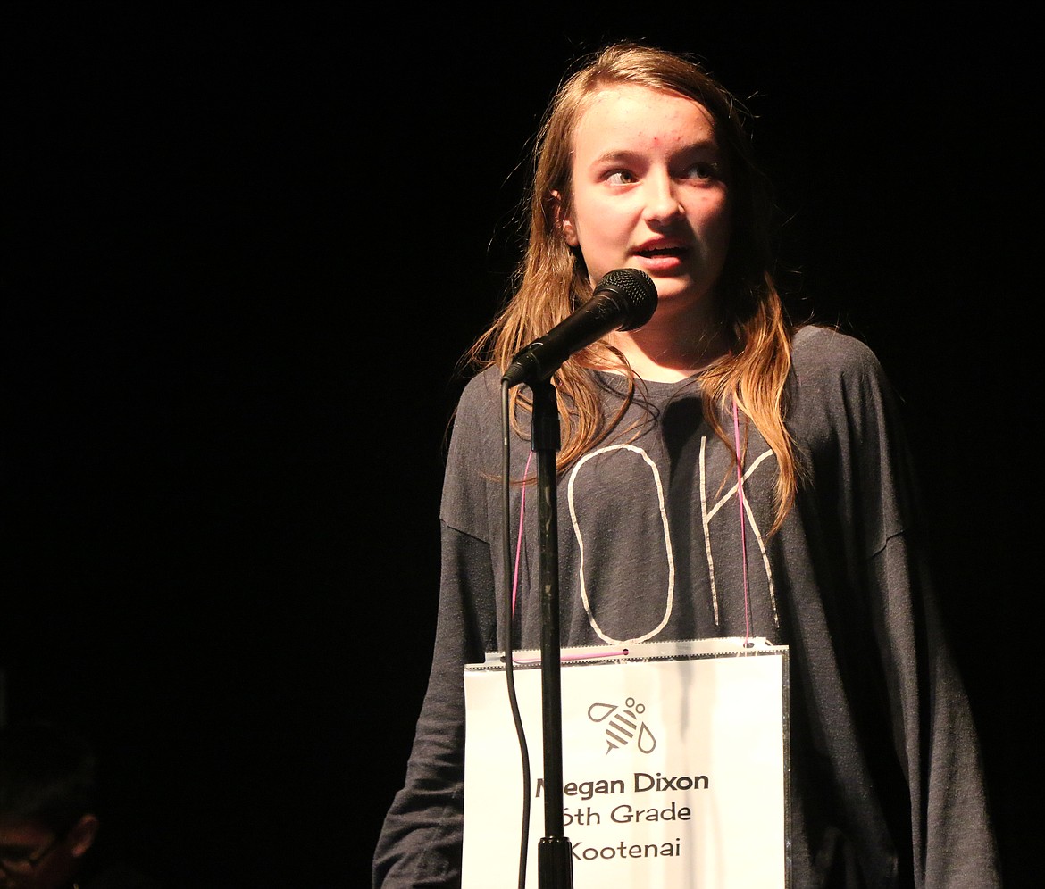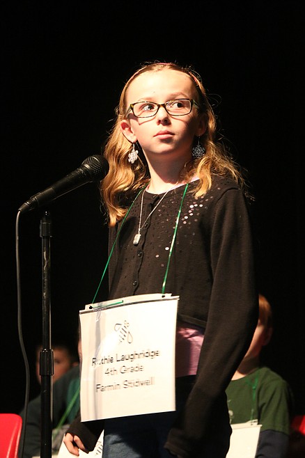 But, as the words buzzed around the Sandpoint High School auditorium — quack,nacho, squirm, crayon, turnip, permafrost, daughter, novelist, badger, alpha, dough — one by one, a missed letter here, a letter out of place there or an extra letter added knocked out the fourth quarter until Farmin Stidwell Elementary students Ruthie Laughridge and Avery Berkey traded correctly spelled words round after found — sword, bribery, penguin, casino, bristle, developer bestow, cough, boorish and carnival.