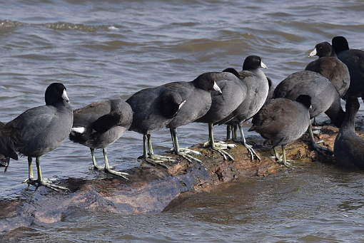 Despite any similarities it shares to ducks and chickens, the American coot (Fulica americana) is actually related to neither. It belongs to the rail family, which is a diverse group of birds consisting of around 151 species. Other members of this family, aside from coots, include crakes, gallinules, and of course rails themselves.