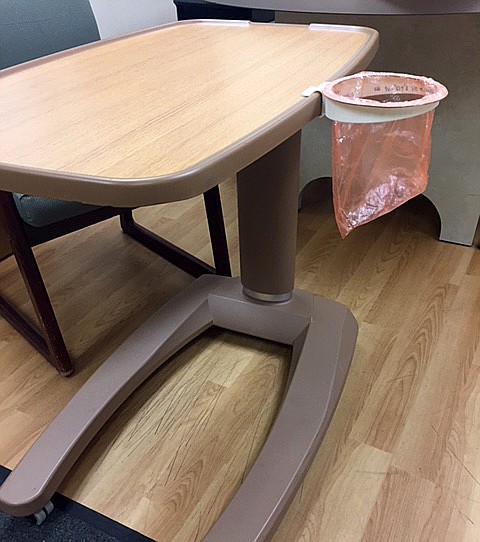 “When a patient is really sick, they can’t get up to throw items like soiled tissues into a trash can,” she explains. “That means that their overbed table gets contaminated tissues on it, alongside their food tray and water pitcher.”