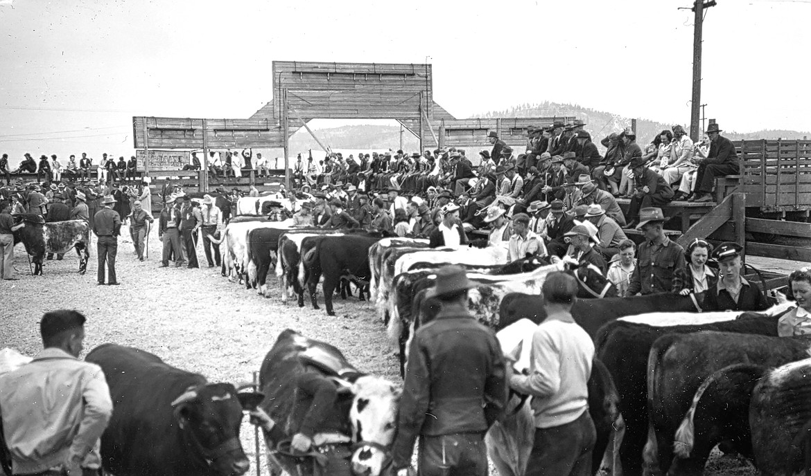 This is a 1940s photograph of the outdoor arena at the fairgrounds. Cattlemen, FFA, and 4-H entrants are lining up to show their dairy cows and steers. Looks to be quite the event! What a fascinating wooden entrance overhead. Are you getting ready for this year’s 100th Boundary County Fair?