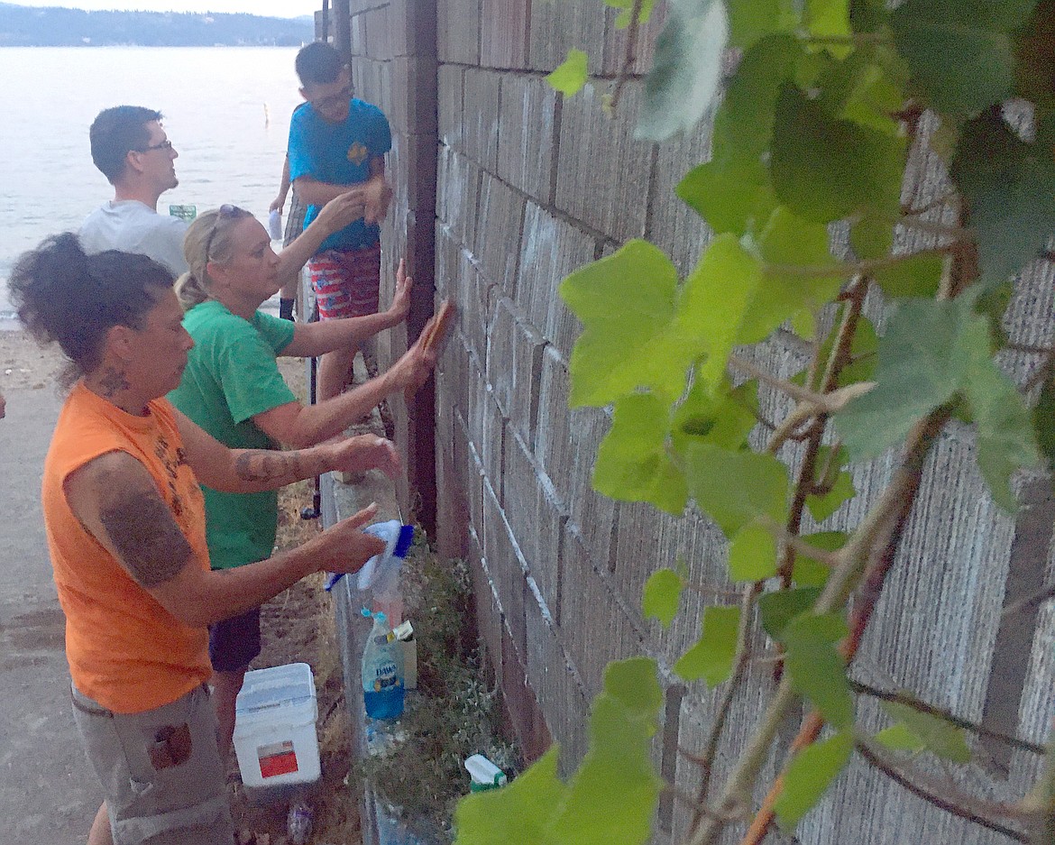 Volunteers scrub Sanders Beach wall to remove graffiti