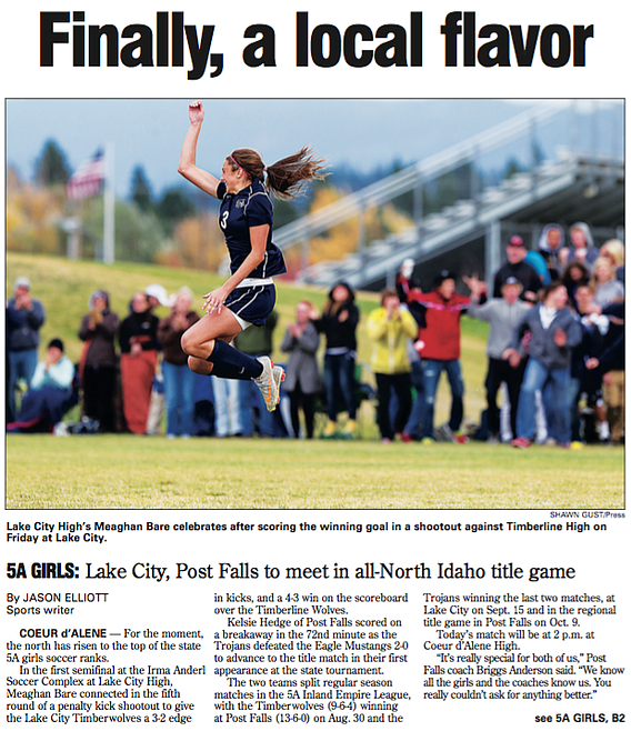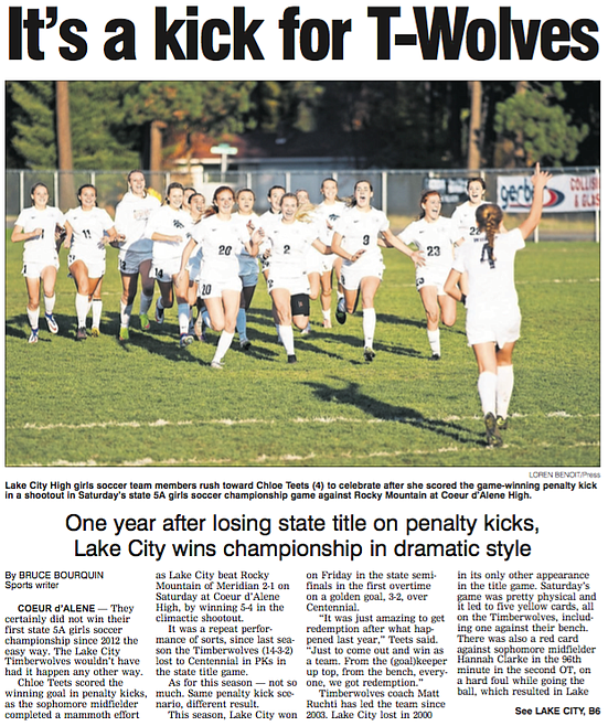 In the championship game at Coeur d’Alene High, Lake City beat Post Falls, also on penalty kicks. Post Falls had beaten the Timberwolves in the regional championship game nine days earlier in Post Falls.