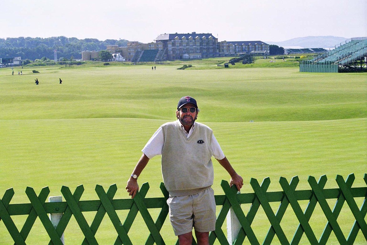 The only things truly factual in the photo would be that, yes, it’s me standing at the fence and, yes, the famous links of St. Andrews make up that wide expanse of grass behind me.