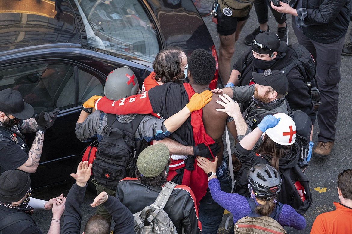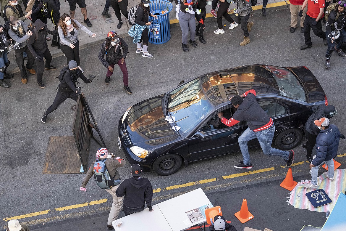 SEATTLE — Authorities say a man drove a car at George Floyd protesters in Seattle Sunday night, hit a barricade then exited the vehicle brandishing a pistol.