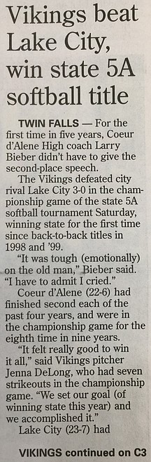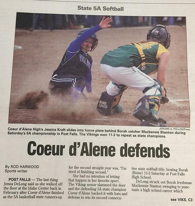 Coeur d’Alene won six straight games over the next two days, all in the losers bracket, including two straight over Centennial in the championship round, to claim the Vikings’ first state title in fastpitch softball.