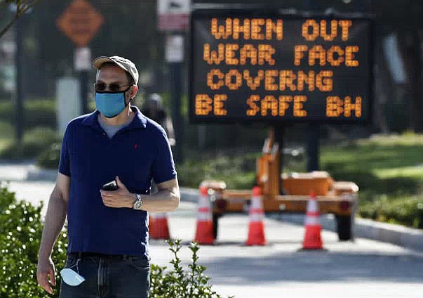 FILE - In this April 16, 2020, file photo, an electronic sign on Santa Monica Boulevard reminds people to wear masks to limit the spread of coronavirus in Beverly Hills, Calif. Gov. Gavin Newsom’s administration on Thursday, June 18, 2020, mandated that Californians wear masks in most indoor settings as the state continues to battle the coronavirus. (AP Photo/Chris Pizzello, File)