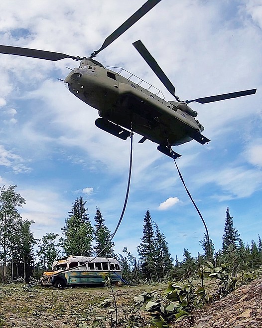 An Alaska National Guard Chinook helicopter flew the bus out of the woods just north of Denali National Park and Preserve on Thursday.
