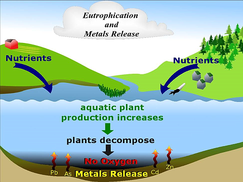 The primary environmental concern in Coeur d’Alene Lake is the potential for release of metal contaminants contained in lake-bottom sediments into the water column. To prevent this from occurring, oxygen levels must be maintained in the bottom waters. Oxygen is controlled by the amount of decomposing organic matter (plant and animal), which is controlled by the amount of nutrients coming into the lake. Increased loads of nutrients (phosphorus and nitrogen) into the lake increase algae and rooted aquatic plant growth through a process known as eutrophication. Bacterial degradation of this organic material consumes dissolved oxygen in the water. Depletion of dissolved oxygen (anoxia) in lake-bottom waters will promote geochemical reactions that can release mining-related hazardous metals from lakebed sediments.