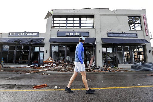 A man walks by buildings destroyed by storms Tuesday, March 3, 2020, in Nashville, Tenn. Tornadoes ripped across Tennessee early Tuesday, shredding buildings and killing multiple people. (AP Photo/Mark Humphrey)