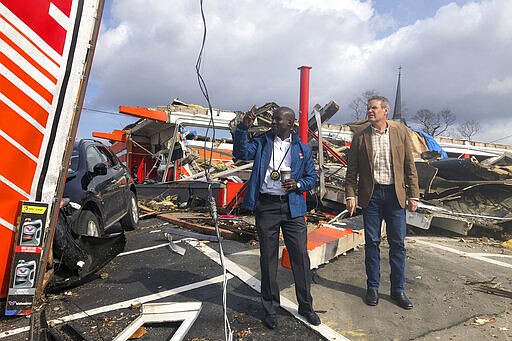 Tennessee Gov. Bill Lee, right and Tennessee Commerce and Insurance Commissioner Hodgen Mainda survey storm damage, in Nashville, Tenn. on Tuesday, March 3, 2020. Tornadoes ripped across Tennessee early Tuesday, shredding at least 40 buildings and killing many people. One of the twisters caused severe damage across downtown Nashville and leaving hundreds of people homeless. (AP Photo/Travis Loller)