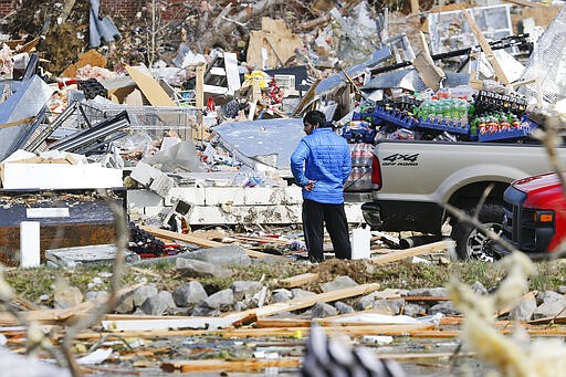 A man looks for items he can salvage from his store Tuesday, March 3, 2020, near Cookeville, Tenn. Tornadoes ripped across Tennessee early Tuesday, shredding more than 140 buildings and burying people in piles of rubble and wrecked basements. At least 22 people were killed. (AP Photo/Mark Humphrey)
