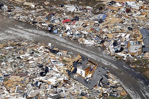 Destroyed homes line a street Tuesday, March 3, 2020, near Lebanon, Tenn. Tornadoes ripped across Tennessee early Tuesday, shredding more than 140 buildings and burying people in piles of rubble and wrecked basements. (AP Photo/Mark Humphrey)