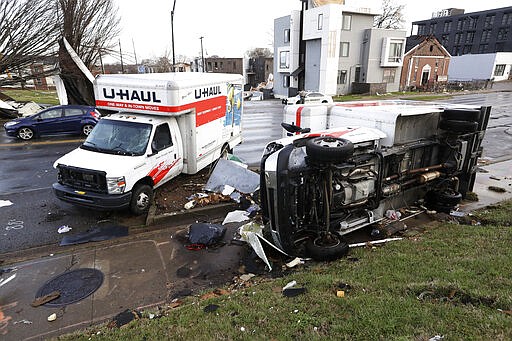 Damaged trucks sit on a sidewalk as well as the street following a deadly tornado, Tuesday, March 3, 2020, in Nashville, Tenn. Tornadoes ripped across Tennessee early Tuesday, shredding buildings and killing multiple people. (AP Photo/Mark Humphrey)
