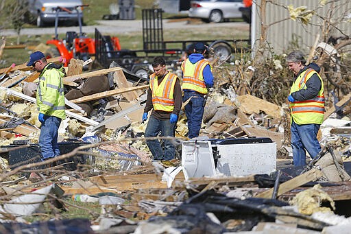 Workers search for victims among the rubble in an area where several people were killed by storms Tuesday, March 3, 2020, near Cookeville, Tenn. Tornadoes ripped across Tennessee early Tuesday, shredding more than 140 buildings and burying people in piles of rubble and wrecked basements. At least 22 people were killed. (AP Photo/Mark Humphrey)