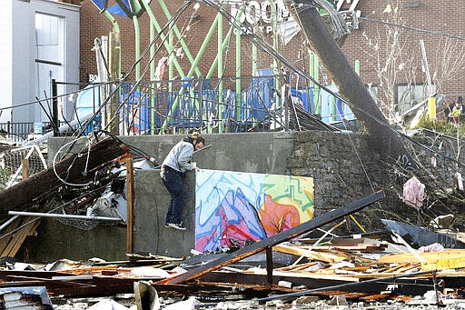 A man climbs through storm debris Tuesday, March 3, 2020, in Nashville, Tenn. Tornadoes ripped across Tennessee early Tuesday, shredding buildings and killing multiple people. (AP Photo/Mark Humphrey)