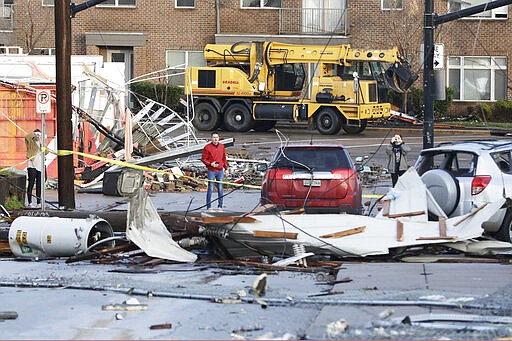 People look over storm damage Tuesday, March 3, 2020, in Nashville, Tenn. Tornadoes ripped across Tennessee early Tuesday, shredding buildings and killing multiple people. (AP Photo/Mark Humphrey)