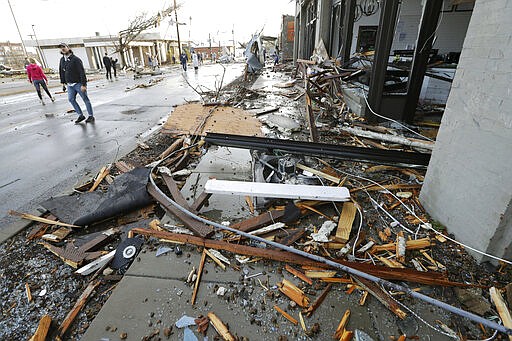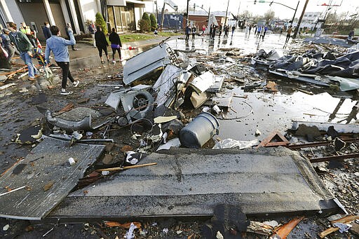 Debris covers a street after overnight storms Tuesday, March 3, 2020, in Nashville, Tenn. Tornadoes ripped across Tennessee early Tuesday, shredding buildings and killing multiple people. (AP Photo/Mark Humphrey)