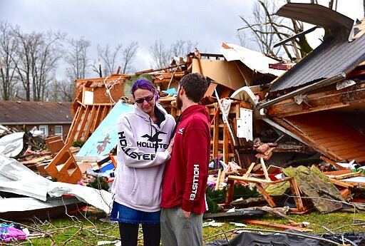 Deanna and Tony Speck, of Cookeville, Tenn., console one another on the front lawn of what's left of Deanna's parent's house off Locust Grove Road on the western edge of Cookeville, Tenn., Tuesday, March 3, 2020. Her parents survived after huddling beneath the staircase as the tornado ripped through the area around 1:30 a.m. (Jack McNeely, Herald-Citizen/The Herald-Citizen via AP)