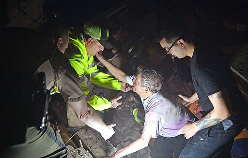 Bill Wallace reaches out to rescue workers who freed him from his home that collapsed on him and his wife Shirley trapping them under rubble after a tornado hit Mt. Juliet, Tenn., on Tuesday, March 3, 2020. ()Larry McCormack/The Tennessean via AP)