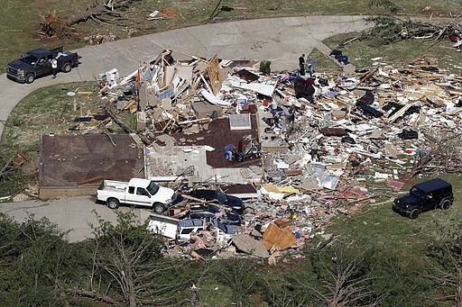 A worker searches for victims among the rubble in an area where several people were killed by storms Tuesday, March 3, 2020, near Cookeville, Tenn. Tornadoes ripped across Tennessee early Tuesday, shredding more than 140 buildings and burying people in piles of rubble and wrecked basements. At least 22 people were killed. (AP Photo/Mark Humphrey)
