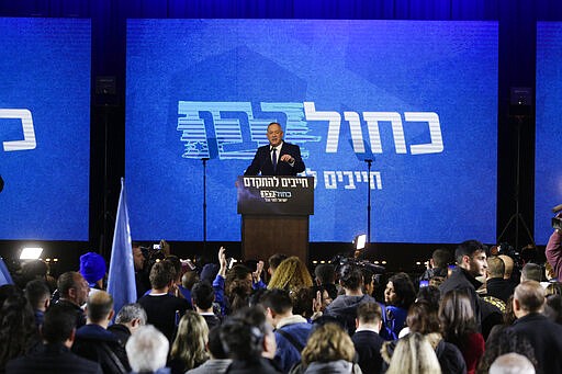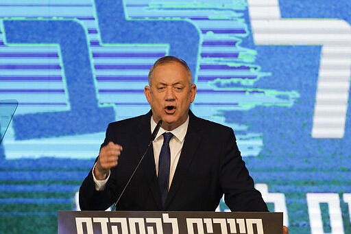 Blue and White party leader Benny Gantz speaks after exit polls for the Israeli elections at party's headquarters in Tel Aviv, Israel, Monday, March 2, 2020. (AP Photo/Sebastian Scheiner)