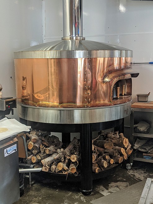 From the bar, one can see the exposed kitchen and wood-fired pizza oven that truly is a work of art. Borrowing the look of an old-fashioned copper still, this unique piece of kitchen machinery cooks pizzas around 750 degrees — roughly 250 to 150 degrees hotter than normal pizza ovens.