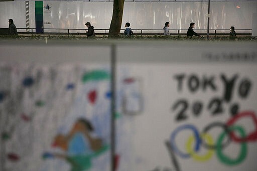 Commuters walk along a sidewalk as a poster celebrating the Tokyo 2020 Olympics is seen in foreground, Tuesday, March 3, 2020, in Tokyo. The Japanese government has indicated it sees the next couple of weeks as crucial to containing the spread of COVID-19, which began in China late last year. (AP Photo/Jae C. Hong)