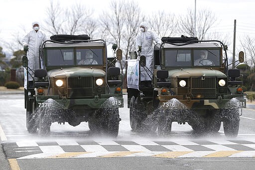 South Korean army trucks spray disinfectant as a precaution against the coronavirus on a street in Ulsan, South Korea, Tuesday, March 3, 2020. China's coronavirus caseload continued to wane Tuesday even as the epidemic took a firmer hold beyond Asia. (Kim Young-tae/Yonhap via AP)