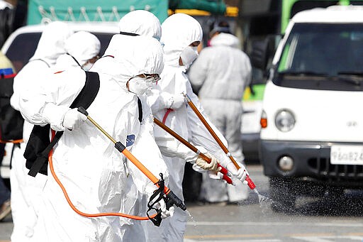 Workers wearing protective gears spray disinfectant as a precaution against the coronavirus at a bus garage in Gwangju, South Korea, Tuesday, March 3, 2020. China's coronavirus caseload continued to wane Tuesday even as the epidemic took a firmer hold beyond Asia. (Shin Dae-hee/Newsisvia AP)