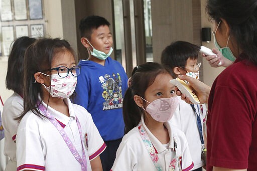 Staff members check students' body temperatures upon their arrival at Jakarta Nanyang School in Serpong on the outskirts of Jakarta, Indonesia, Tuesday, March 3, 2020. Indonesia confirmed its first cases of the coronavirus Monday in two people who contracted the illness from a foreign traveler. (AP Photo/Tatan Syuflana)