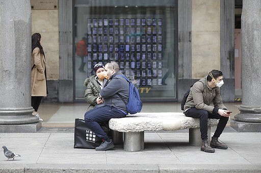 FILE - In this Thursday, Feb. 27, 2020, file photo, people wearing face masks sits on a bench in Milan, Italy. Health officials say passengers who flew on a jet with a Georgia man who later tested positive for the COVID-19 virus were never screened based on guidance from the Centers for Disease Control and Prevention. At a Tuesday, March 3, 2020, news briefing, local health officials said the 56-year-old Fulton County man had traveled to Atlanta from Milan, Italy, on Feb. 22 and didn’t show symptoms of the disease until a few days after his flight. (AP Photo/Luca Bruno, File)