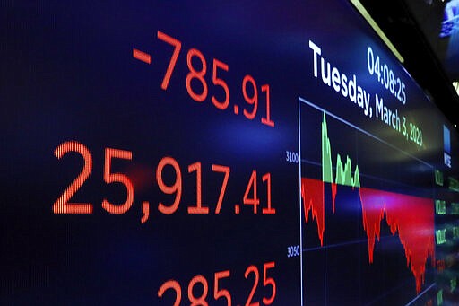 A board above the trading floor of the New York Stock Exchange shows the closing number for the Dow Jones Industrial Average, Tuesday, March 3, 2020. The DJIA dropped 785 points and bond prices surged after an emergency interest-rate cut by the Federal Reserve failed to reassure markets racked by worries that a fast-spreading virus outbreak could lead to a recession. (AP Photo/Richard Drew)