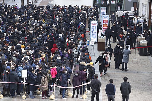 Hundreds of people line up to buy face masks to protect themselves from the coronavirus in front of a department store in Seoul, South Korea, Tuesday, March 3, 2020. China's coronavirus caseload continued to wane Tuesday even as the epidemic took a firmer hold beyond Asia, with three countries now exceeding 1,000 cases and the U.S. reporting its sixth death. (Hong Hae-in/Yonhap via AP)