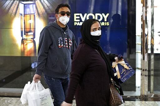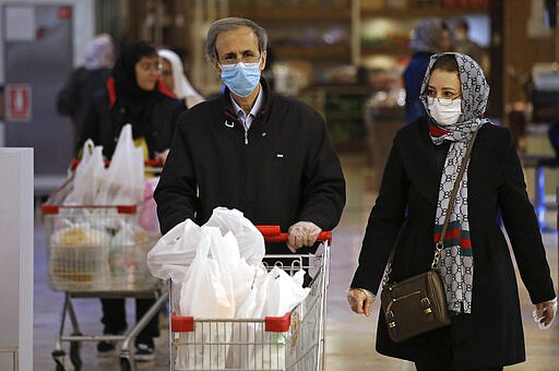 Shoppers wearing face masks and gloves shop at the Palladium Shopping Center, in northern Tehran, Iran, Tuesday, March 3, 2020. Iran's supreme leader put the Islamic Republic's armed forces on alert Tuesday to assist health officials in combating the outbreak of the new coronavirus, the deadliest outside of China. (AP Photo/Vahid Salemi)