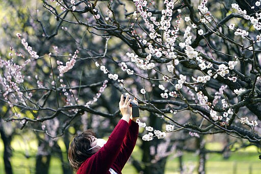 A tourist wearing a protective mask takes a photo of flower blooming Tuesday, March 3, 2020, at a park in Tokyo. The number of infections of the COVID-19 disease spread around the globe. (AP Photo/Eugene Hoshiko)