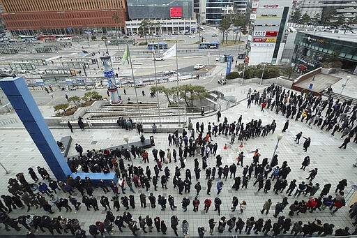 People line up to buy face masks to protect themselves from the new coronavirus in front of Seoul Railway Station in Seoul, South Korea, Tuesday, March 3, 2020. China's coronavirus caseload continued to wane Tuesday even as the epidemic took a firmer hold beyond Asia. (Hong Hae-in/Yonhap via AP)