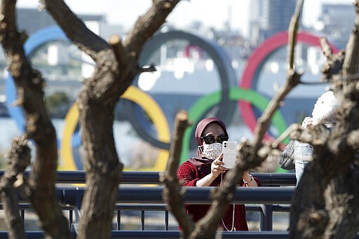 A tourist wearing a protective mask takes a photo with the Olympic rings in the background Tuesday, March 3, 2020, at Tokyo's Odaiba district. The spreading virus from China has put the Tokyo Olympics at risk. The Olympics are to open on July 24 - less than five months away. (AP Photo/Eugene Hoshiko)