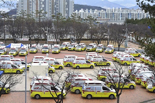 Ambulances are parked to transport patients with mild symptoms of the coronavirus in Daegu, South Korea, Tuesday, March 3, 2020. China's coronavirus caseload continued to wane Tuesday even as the epidemic took a firmer hold beyond Asia. (Lee Moo-ryul/Newsisvia AP)